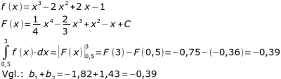 Die Funktion lautet <m>f(x) =x^3 - 2 x^2 + 2 x- 1</m> und die Integralgrenzen wurde zu a=0,5 und b=3 festgelegt.